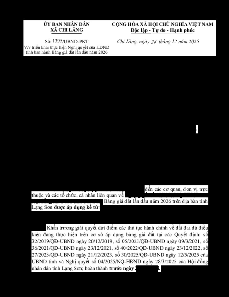 | Tiêu đề văn bản | về việc triển khai thực hiện nghị Quyết của HĐND tỉnh ban hành bảng giá đất lần đầu năm 2026 | ||