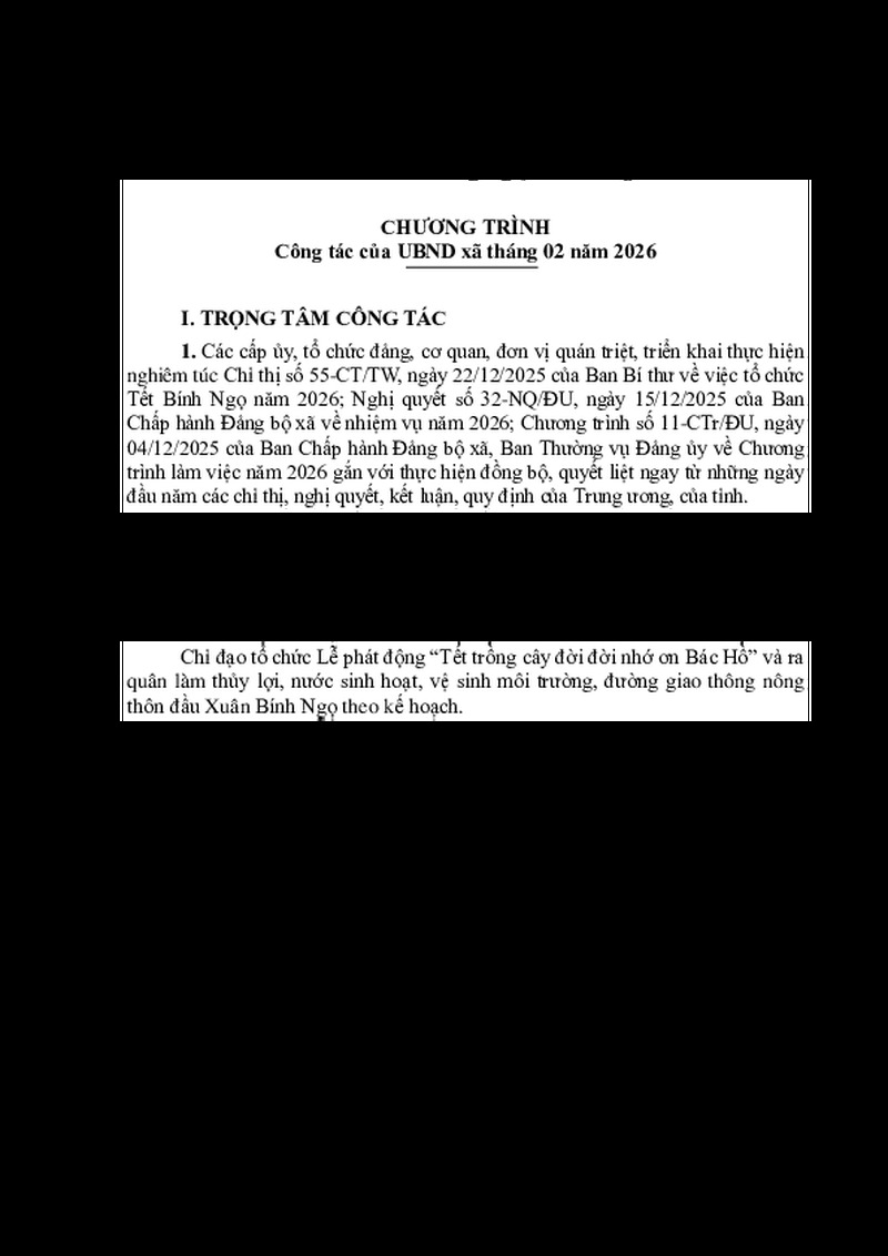 | Tiêu đề văn bản | CHƯƠNG TRÌNH Công tác của UBND xã tháng 02 năm 2026 | ||