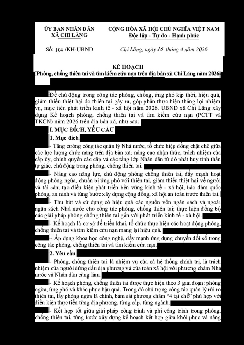 | Tiêu đề văn bản | KẾ HOẠCH Phòng, chống thiên tai và tìm kiếm cứu nạn trên địa bàn xã Chi Lăng năm 2026 | ||
