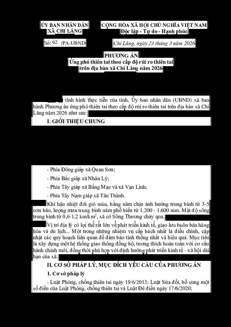 | Tiêu đề văn bản | PHƯƠNG ÁN Ứng phó thiên tai theo cấp độ rủi ro thiên tai trên địa bàn xã Chi Lăng năm 2026 | ||