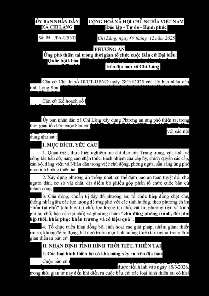 | Tiêu đề văn bản | PHƯƠNG ÁN Ứng phó thiên tai trong thời gian tổ chức cuộc Bầu cử Đại biểu Quốc hội khóa XVI và đại biểu Hội đồng nhân dân các cấp nhiệm kỳ 2026 – 2031 trên địa bàn xã Chi Lăng | ||