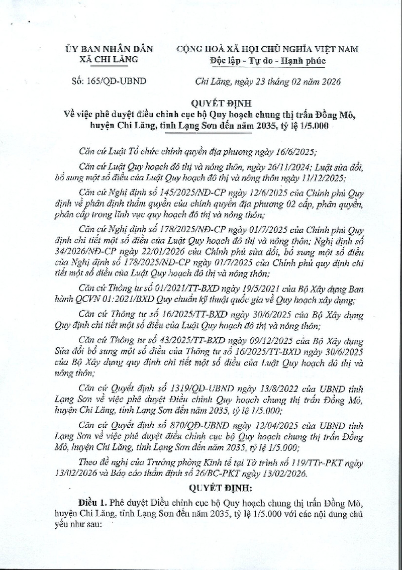 | Tiêu đề văn bản | Quyết định về việc phê duyệt điều chỉnh cục bộ quy hoạch chung thị trấn Đồng mỏ, huyện Chi Lăng, tỉnh Lạng Sơn đến năm 2035, tỷ lệ 1/5.000 | ||