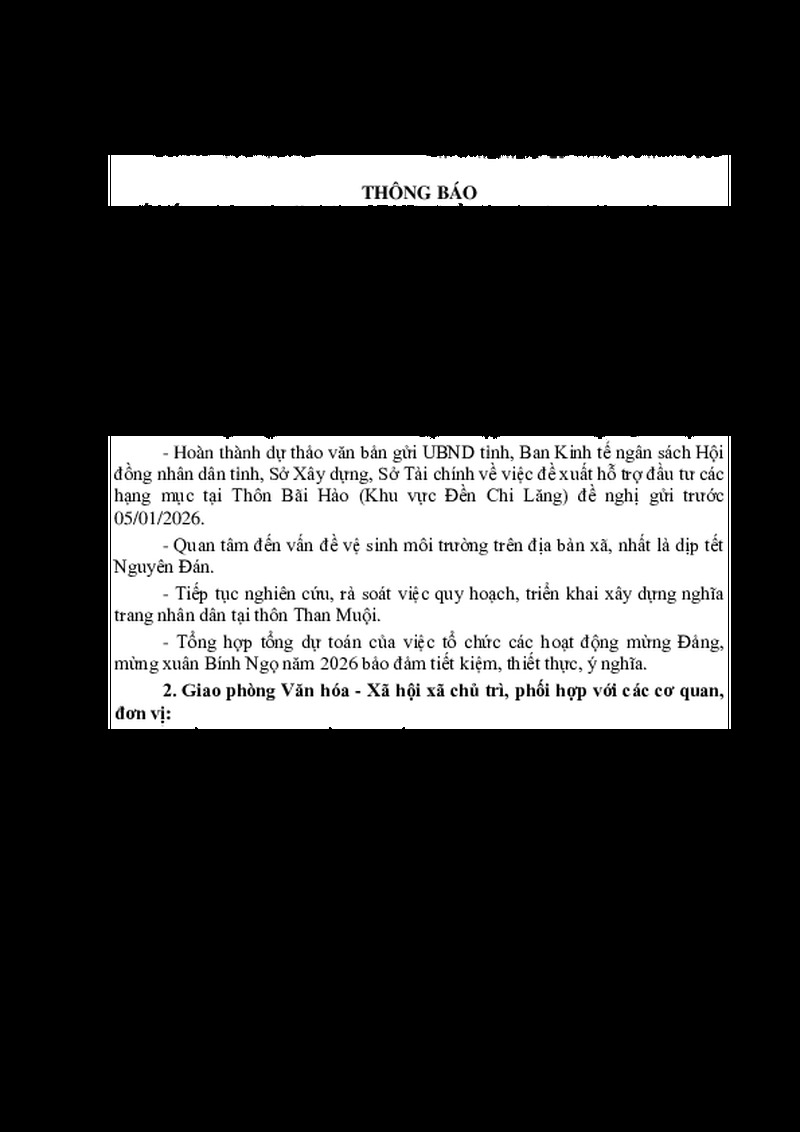 | Tiêu đề văn bản | THÔNG BÁO Ý kiến chỉ đạo của Chủ tịch UBND xã về việc giao thực hiện nhiệm vụ Tại Thông báo số 100-TB/ĐU, ngày 26/12/2025 | ||