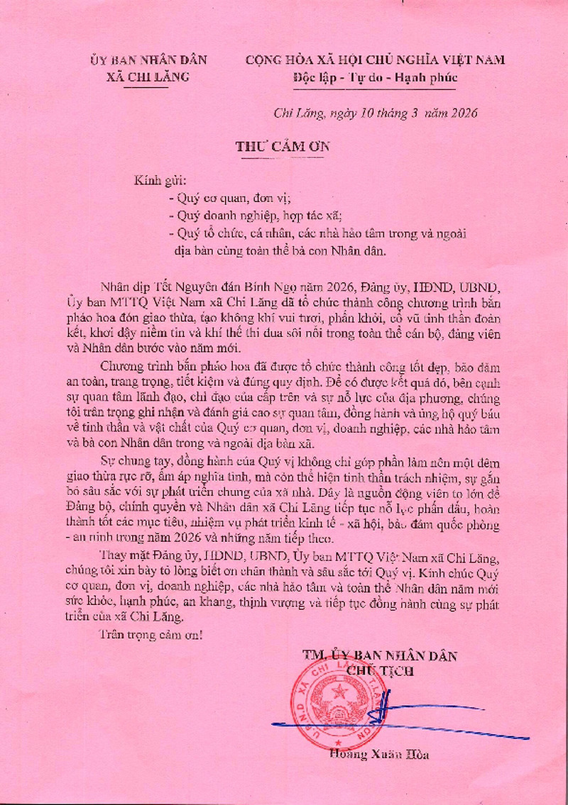 | Tiêu đề văn bản | Thư cảm ơn | ||