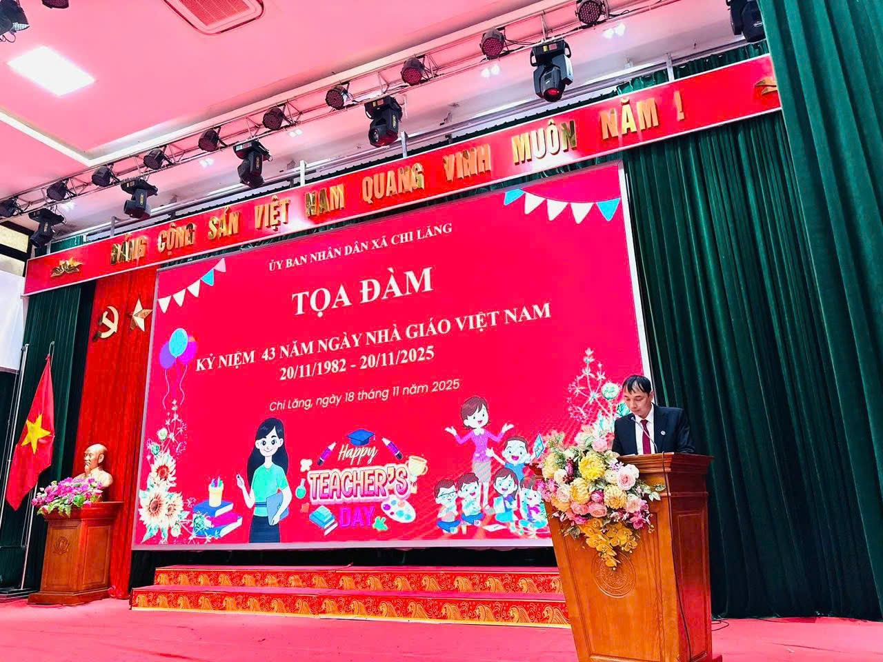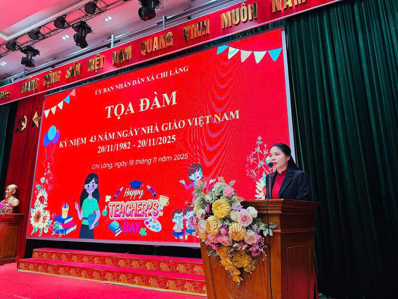 Chiều ngày 18/11/2025, tại Hội trường UBND xã Chi Lăng, Đảng ủy - HĐND - UBND - UBMTTQ xã tổ chức buổi tọa đàm gặp mặt, chúc mừng Ngày Nhà giáo Việt Nam. Dự và phát biểu tại buổi tọa đàm, đồng chí Dương Thị Huyền Phương – Tỉnh ủy viên - Bí thư Đảng ủy xã đã ghi nhận, biểu dương những thành tích mà ngành giáo dục xã Chi Lăng đạt được trong thời gian qua; đồng thời gửi lời chúc mừng tới toàn thể đội ngũ thầy giáo, cô giáo đang giảng dạy trên địa bàn xã.